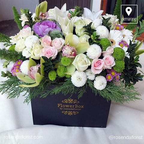 Mix flower dirangkai diatas box. Untuk rangkaian mix flower,Warna , jenis, tidak bisa sama persis. Tema = warna pastel soft. Ada tambahan cymbidium orchid.