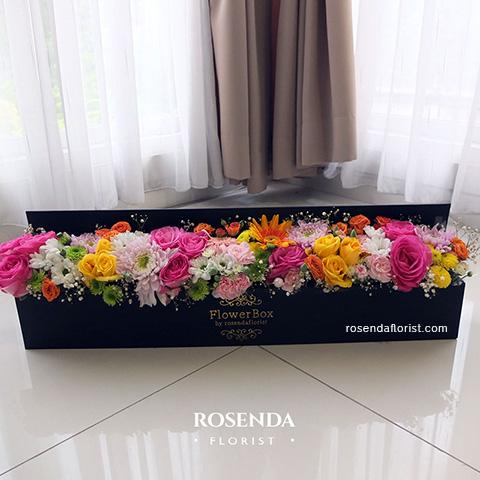 Rangkaian mix flower dibibir Box (lv1) dibuat 1 sisi. Silahkan hub admin kami jika menghendaki tipe ini untuk rangkaian di tengah meja ( melingkar ). Dapat juga diisi dengan full bunga mawar, baik lv0 = bunga didalam box,maupun LV1