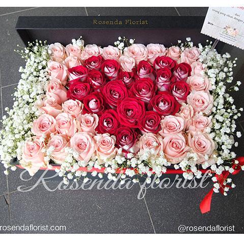 Style = lv1 = bunga berada di bibir box (box tidak dapat ditutup sempurna . Jumlah bunga yang digunakan selalu berubah tergantung ukuran bunga. Box diisi full bunga mawar+babybreath. Dapat pula tanpa bentuk hati di tengah nya.