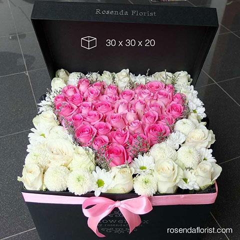 Custom angka/huruf max 2 digit/ heart shape. Style box = lv1 = bunga berada di bibir box (box tidak dapat ditutup sempurna . Jumlah bunga yang digunakan selalu berubah tergantung ukuran bunga. Bunga yang digunakan dominan mawar.